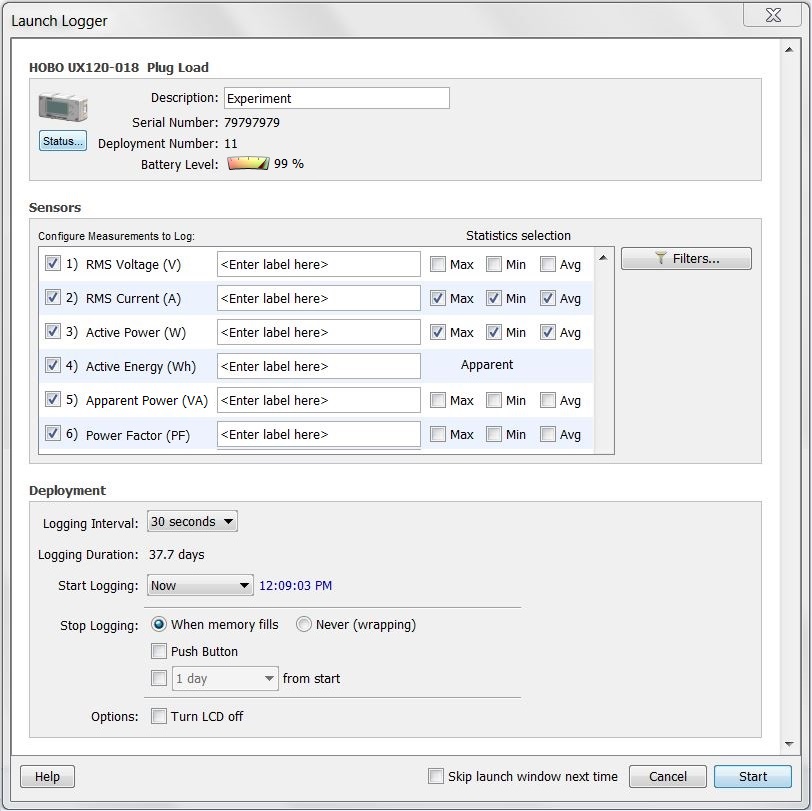 以下啟動(dòng)選項(xiàng)可用于HOBO插頭負(fù)載記錄器(UX120-018)。 請(qǐng)注意,啟動(dòng)記錄器窗口可能與下面所示的示例不同。 該記錄儀還能夠在儀表模式下操作而不記錄數(shù)據(jù)。 有關(guān)該功能的詳細(xì)信息,請(qǐng)參閱記錄器手冊(cè)。