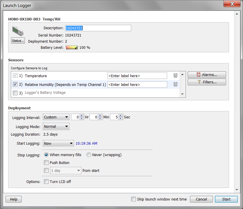 開始日志記錄。選擇何時啟動記錄器。默認(rèn)為記錄器以前啟動的設(shè)置(您可以使用“常規(guī)”首選項的“啟動節(jié)省時間選項”子類別在HOBOware Pro中更改此設(shè)置)。您可以選擇啟動此記錄器: