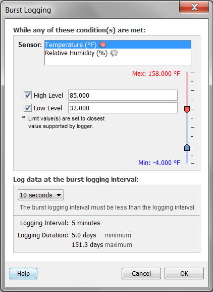 脈沖串日志記錄級別的實際值設置為記錄器支持的最接近的值。例如,記錄器可記錄的最接近85°F的值為84.990°F,最接近32°F的值為32.043°F。