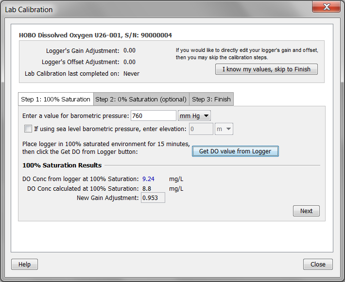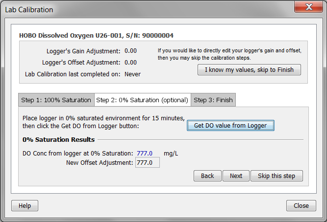 如果記錄儀將部署在DO水平大于4 mg / L的水中,請單擊“跳過此步驟”按鈕。否則,請繼續執行以下過程。