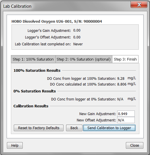 如果您已經知道增益和偏移值應該是什么(例如,您想要再次使用的上次校準的值)或想要返回到默認出廠值,請單擊“我知道我的值,跳到完成“按鈕。這將自動移動到“步驟3:完成”。單擊“重置為出廠默認值”按鈕或鍵入新的增益調整和新的偏移調整值,然后單擊“發送校準到記錄器”按鈕。注意:如果您決定不需要更改校準,請單擊關閉取消校準并恢復到上次保存的記錄器值。