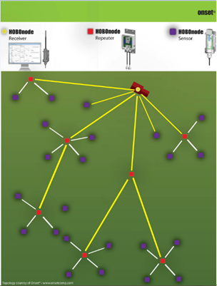 •您可以使用多個HOBOnode中繼器克服視線限制。