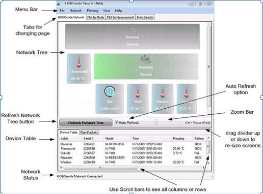 下圖顯示了HOBOnode Viewer主窗口。有關Windows和功能的更多詳細信息,請參閱HOBOnode Viewer參考。