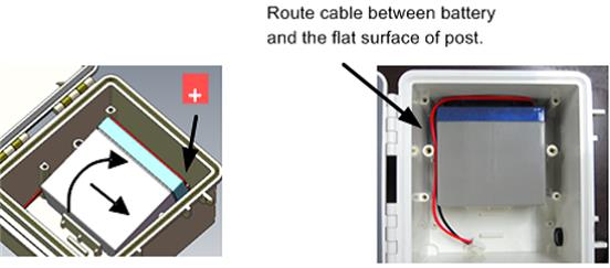 7.將電池正極(+)端子朝機箱右上角安裝。以一定角度插入電池,底部靠在擱板上,情況如圖所示。將電池平放到位,然后將其向右推,為電纜留出空間。確保電纜的位置如下圖所示,在電池和中央左柱之間布線。 這樣可以確保電纜能夠到達記錄器上的電池連接器。