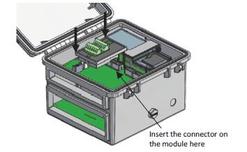通過拉動電池和充電器連接來確保工作站斷電。將可選的RXMOD-x模塊插入模塊1或模塊2的插槽中,方法是將連接器插入機箱上的插座。
