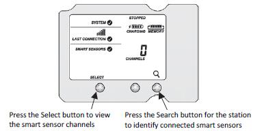 b。按下“選擇”按鈕以查看液晶顯示屏上的智能傳感器,然后按下“搜索”按鈕(放大鏡圖標應可見,如下例所示)。該站將搜索所有