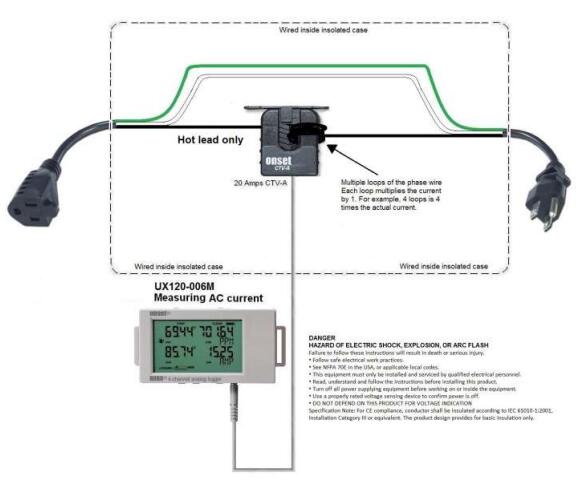 UX120-006M 和MX1105監測單相交流電流的接線圖 附圖顯示了如何使用 HOBO UX120-006M 4 通道模擬輸入記錄器和 CTV-A 電流互感器測量通過電源線的交流電流。 注意:此圖僅作為示例,說明如果要監控電流,需要如何將熱線與電源線分開。將 CT 夾在整根電線上是行不通的。 如果將熱線與電源線分開,并且應將電源線放置在如圖所示的保護外殼中,則必須格外小心。